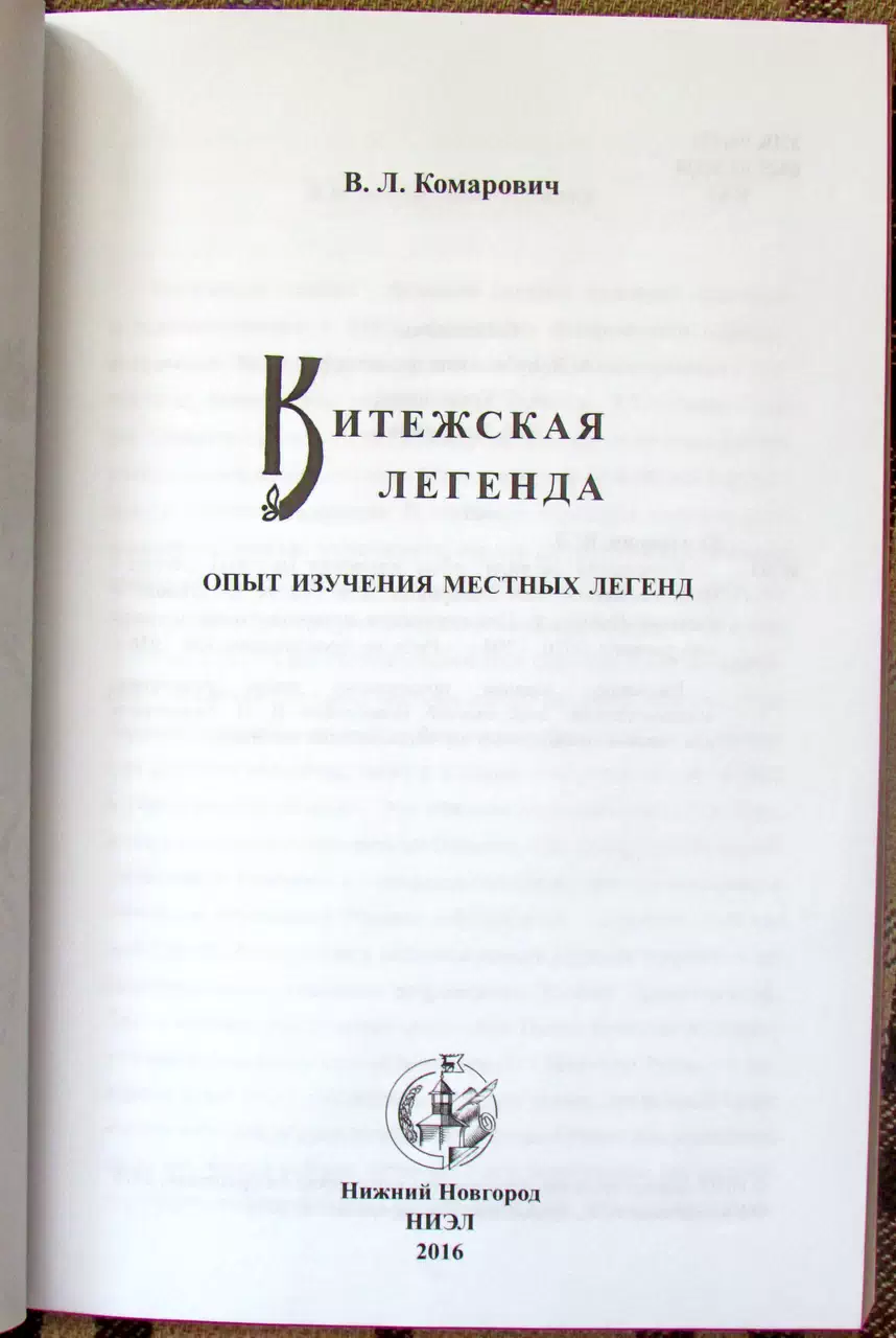 204 с., + карта. Мягкий переплет. Увеличенный 60х90 1/16 формат. Цена с учетом доставки по России. Тираж 100 экз. Стоимость: 4950р. КУПИТЬВысококачественное репринтное издание: М.-Л. АН СССР, 1936 г., снабжено обширным предисловием от редколлегии, именным и географическим указателями. Приложения: 1) публикация текста `Книга глаголемая летописец`, 2) публикация текста `Летописец о убиении`, 3) раскладная карта. Из предисловия: долгое время никаких подтверждений выдвинутых идей В. Л. Комаровича о существовавшем в XV в. на берегах Светлояра поселении не было, хотя некоторые изыскания в районе озера проходили со второй половины XIX в. Лишь в октябре 2011 г. участниками Ветлужской археологической экспедиции музея ННГУ им. Н. И. Лобачевского под руководством Е. В. Четвертакова были выявлены остатки русского средневекового селища, некогда располагавшегося на двух самых живописных «горах» озера - Благовещенской и Успенской. На всей территории данного поселения были обнаружены многочисленные фрагменты керамической посуды, а при проведении археологических изысканий была собрана представительная коллекция артефактов, позволяющих датировать обнаруженный памятник в рамках периода XIV - первой половины XV в. Таким образом, догадка В. Л. Комаровича о существовании в период XV в. на берегах озера реального исторического поселения была полностью подтверждена. Состояние: Отличное.