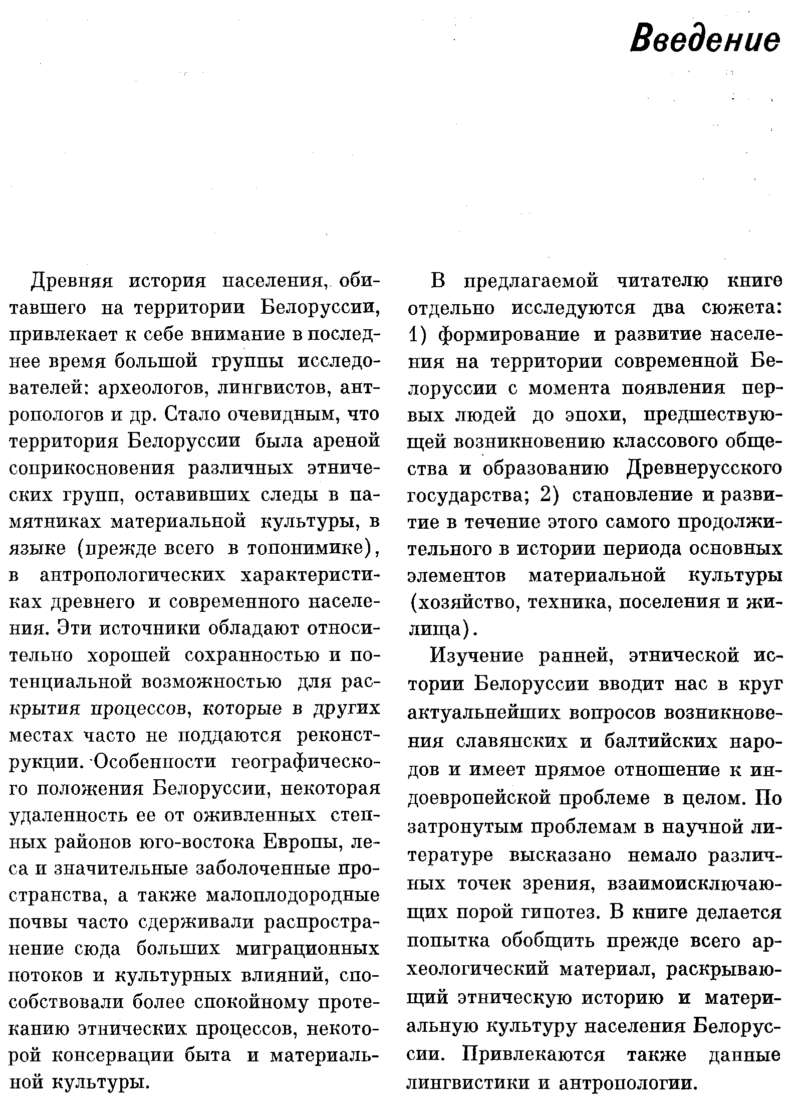 136 с., илл., схемы, таблицы. Твердый переплет. Увеличенный 70х90 1/16 формат. Цена с учетом доставки. Тираж 2000 экз. Стоимость: 9950р. КУПИТЬПрижизненное издание автора, редчайшее издание. В книге на основе археологических, лингвистических, антропологических источников исследуется история формирования населения Белоруссии с древнейших времен до IX в. н. э. Большое внимание уделяется вопросам возникновения славян и балтов, взаимодействия различных этнических групп. Раскрывается картина культурно-хозяйственного развития. Книга рассчитана на научных работников, преподавателей аспирантов и студентов. В книге отдельно исследуются два сюжета: 1) формирование и развитие населения на территории современной Белоруссии с момента появления первых людей до эпохи, предшествую щей возникновению классового общества и образованию Древнерусского государства; 2) становление и развитие в течение этого самого продолжительного в истории периода основных элементов материальной культуры (хозяйство, техника, поселения и жилища). Изучение ранней, этнической истории Белоруссии вводит нас в круг актуальнейших вопросов возникновения славянских и балтийских народов и имеет прямое отношение к индоевропейской проблеме в целом. По затронутым проблемам в научной литературе высказано немало различных точек зрения, взаимоисключающих порой гипотез. В книге делается попытка обобщить прежде всего археологический материал, раскрывающий этническую историю и материальную культуру населения Белоруссии. Привлекаются также данные лингвистики и антропологии. Содержание: Список сокращений; Введение; Источники. Полевые исследования. Литература; Формирование населения в каменном веке; Расселение индоевропейцев. Ранние балты и славяне; Восточные славяне. Становление и развитие хозяйства; Первобытная техника; Жилища и поселения; Заключение. Состояние: Отличное.